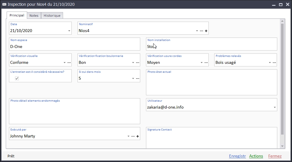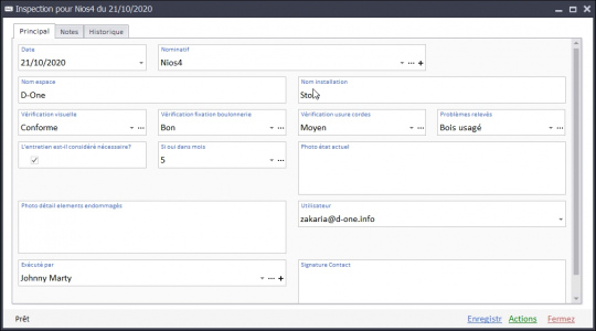 Entrez les clients et planifiez les inspections que vos techniciens auront à faire avec cette base de données de base qui vous permet d'avoir une carte de collecte de données très approfondie. Grâce à l'affectation directe des détecteurs techniques et cloud Nios4, ils auront toujours sur leur smartphone la liste à jour des inspections et inspections à effectuer sans avoir besoin de se rendre dans vos locaux.