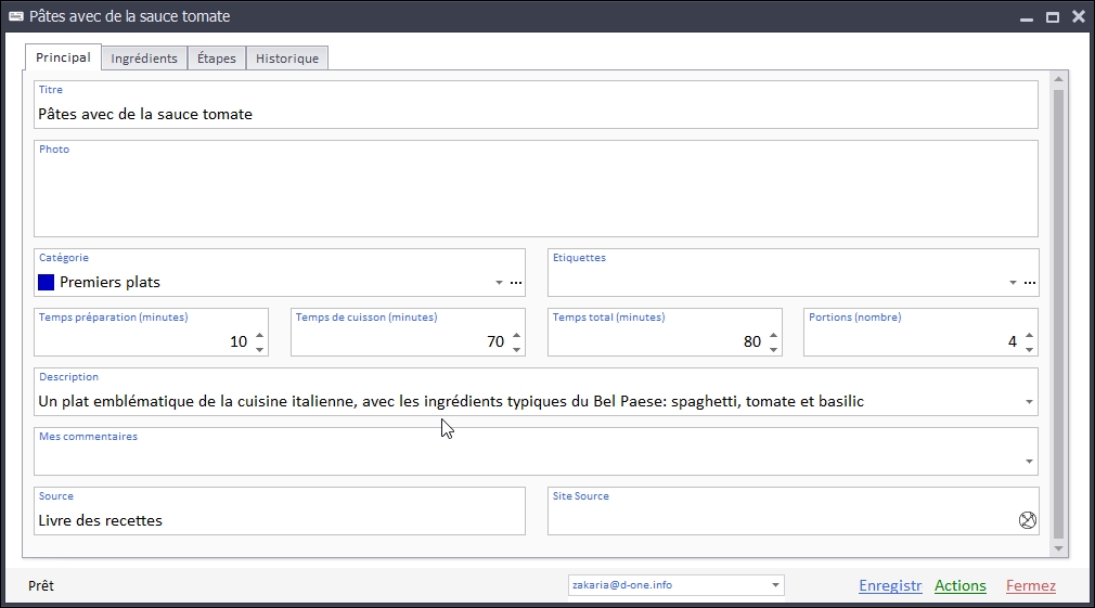 La collection de mes recettes. Un modèle simple qui montre comment gérer l'insertion de données sur des détails ou dans des tableaux.